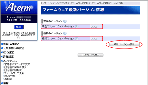 「最新のファームウェアバージョン」が、「現在のファームウェアバージョン」よりも新しい場合には、更新してください。 |