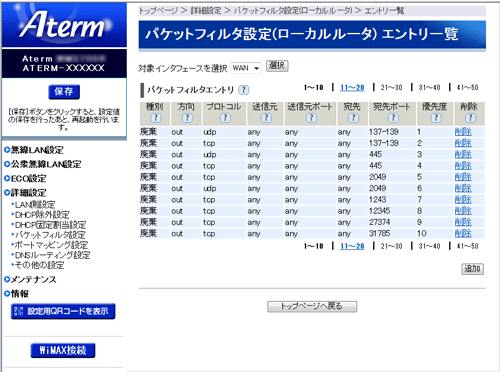 ■パケットフィルタ設定(ローカルルータ) エントリ一覧