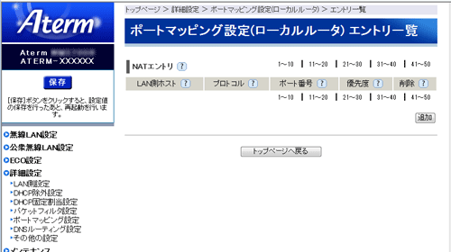 | ■ポートマッピング設定(ローカルルータ) エントリ一覧 |