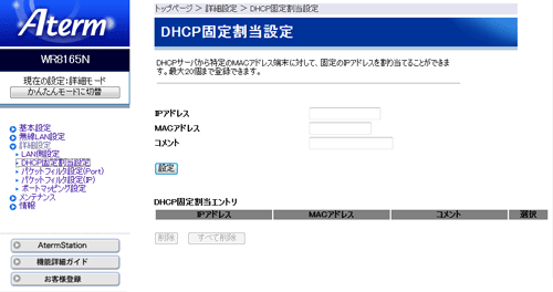 本商品では、「DHCP固定割当設定」のエントリを20個まで設定できます。 |