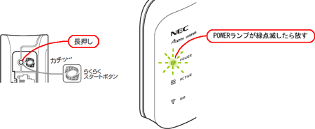 無線LAN親機のらくらくスタートボタンを長押し(約6秒)、POWERランプが緑点滅になったら放す