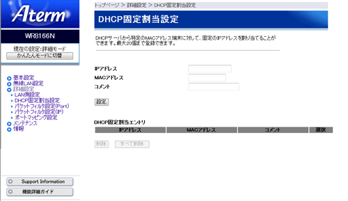 本製品では、「DHCP固定割当設定」のエントリを20個まで設定できます。 |
