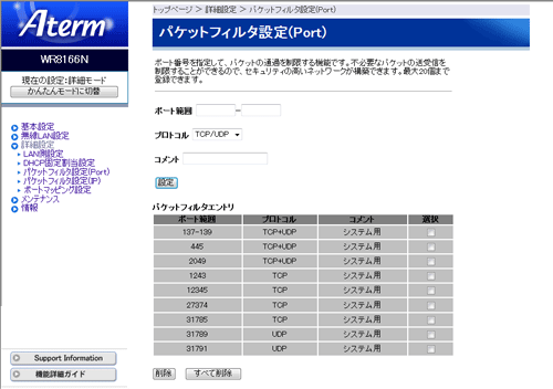 パケットフィルタエントリに表示されたリストの中から、削除したいエントリの行末の「選択」にチェックして、[削除]をクリックすることで削除できます。設定をすべて削除する場合は、[すべて削除]をクリックします。 |