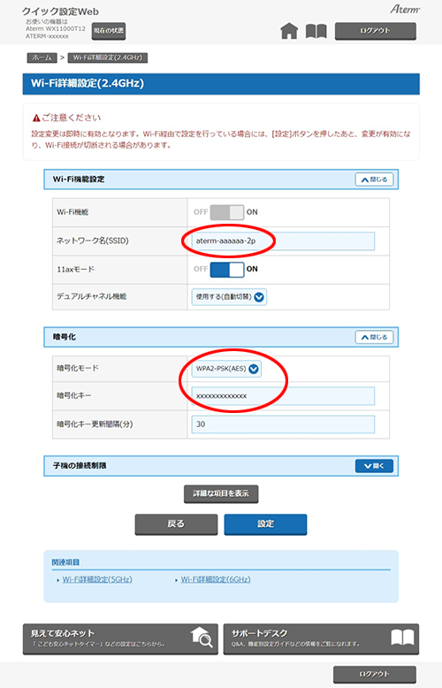 (1)ホーム画面の「子機との接続設定」-「Wi-Fi詳細設定(2.4GHz)」をクリックします。