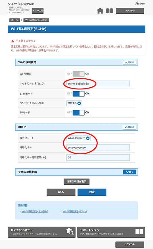 (1)ホーム画面の「子機との接続設定」-「Wi-Fi詳細設定(5GHz)」をクリックします。