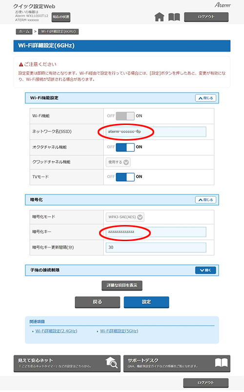 (1)ホーム画面の「子機との接続設定」-「Wi-Fi詳細設定(6GHz)」をクリックします。