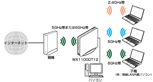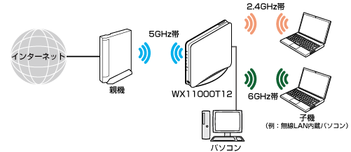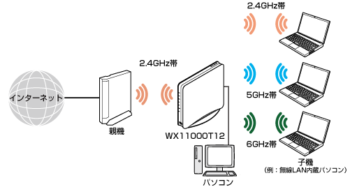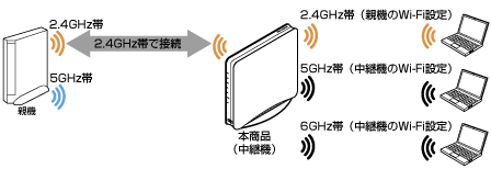 ※ 中継機(本商品)と子機の間の通信は、2.4GHz帯と5GHz帯を使用した場合の例です。2.4GHz帯と6GHz帯、5GHz帯と6GHz帯を使用することもできます。