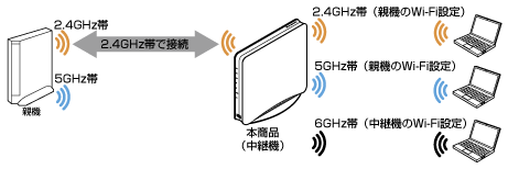 親機と中継機(本商品)間、中継機(本商品)と子機間ともに2.4GHz帯で通信します。