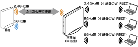 ※ 中継機(本商品)と子機の間の通信は、2.4GHz帯を使用した場合の例です。6GHz帯を使用することもできます。