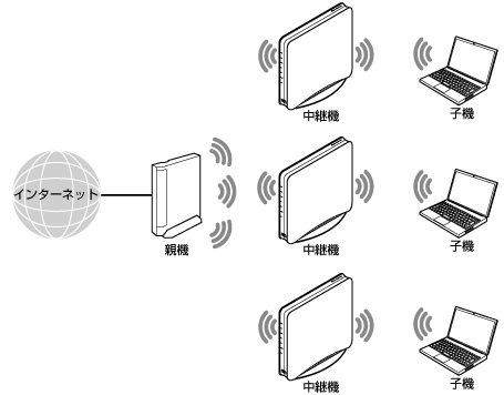 本商品は、親機と子機の間で電波を中継(リレー)する中継機として使用できます。親機と子機の通信できる範囲がさらに広がり、障害物の影響で電波の届きにくい場所でもWi-Fi通信が可能です。ネットワーク環境や用途に合わせて設定してください。