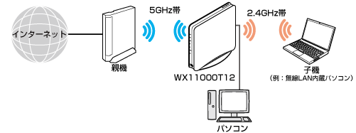 ※ 中継機(本商品)と子機の間の通信は、2.4GHz帯を使用した場合の例です。5GHz帯を使用することもできます。