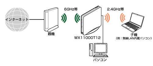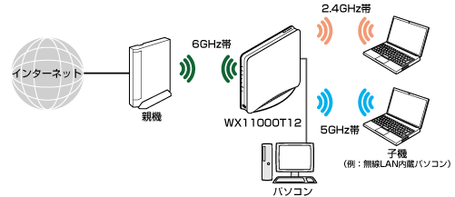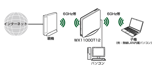 ※ 中継機(本商品)と子機の間の通信は、6GHz帯を使用した場合の例です。5GHz帯を使用することもできます。