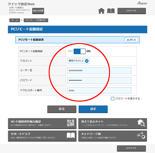 「PCリモート起動機能」を「ON」に設定し、以下の項目を入力したあと[設定]をクリックします。