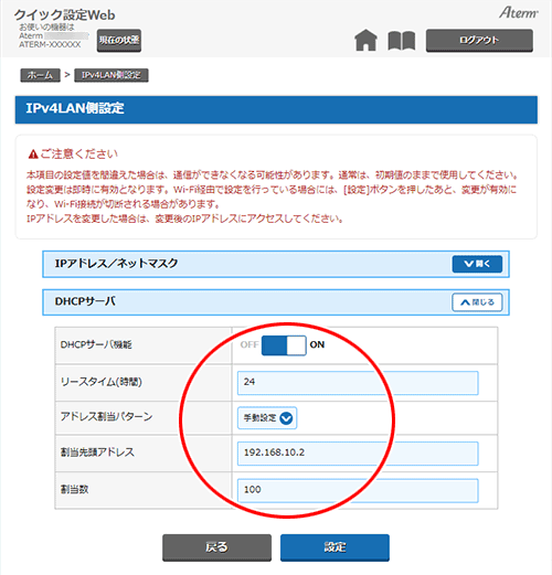 割り当てるIPアドレスの範囲を設定する(DHCP除外)