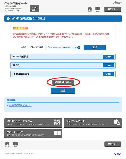 ※ 画面は「Wi-Fi詳細設定(2.4GHz)」の場合の例です。
