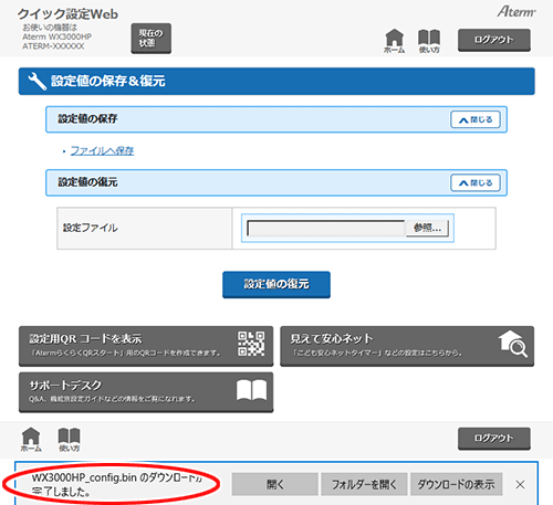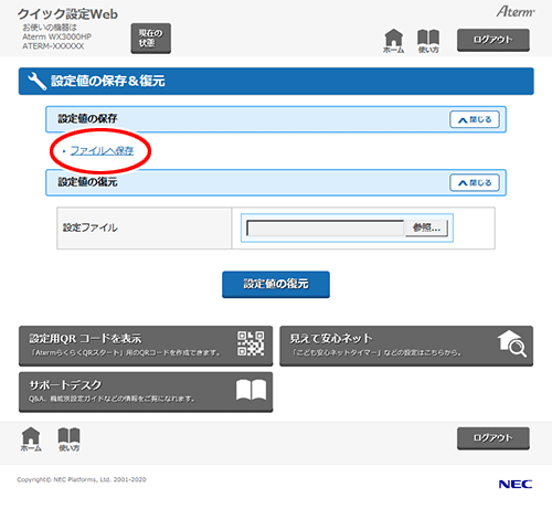 Wi-Fi接続に必要な情報やファームウェアのバージョンなど、本商品の装置情報を確認できます。また、本商品を初期化する場合などに、設定内容を保存し復元することができます。(管理者パスワードなど、装置を識別/管理するための情報は、保存と復元の対象にはなりません。)
