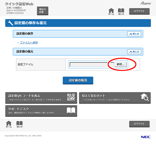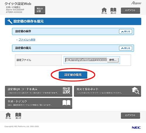 選択したファイルの保存先パスが入ります。[設定値の復元]をクリックします。