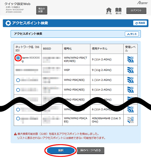 ※ 接続したい親機のネットワーク名(SSID)が表示されない場合は、親機に設定されているWi-Fiのステルス設定を解除してから、再度本設定を行ってください。
