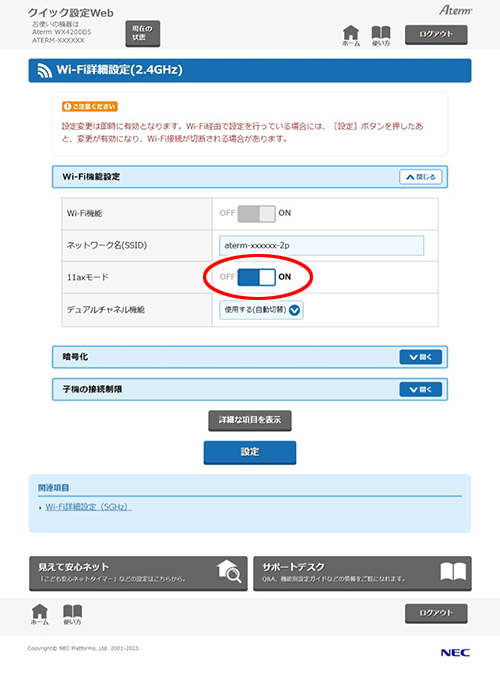 本商品はIEEE802.11ax技術を利用し、複数の端末と同時に安定した通信を実現するため、「11axモード」は工場出荷状態で「ON」に設定されています。「11axモード」を「OFF」にすると、子機によっては通信が安定する場合があります。