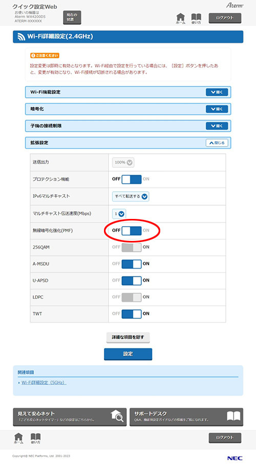 「無線暗号化強化(PMF)」を「OFF」に設定します。
