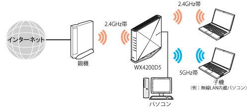 中継機(本商品)と子機間は、5GHz帯通信と2.4GHz帯通信の両方を同時に使用することができます。子機は、5GHz帯のネットワークか2.4GHz帯のネットワークを選択して接続することができます。 親機と中継機(本商品)間は、5GHz帯または2.4GHz帯で通信します。