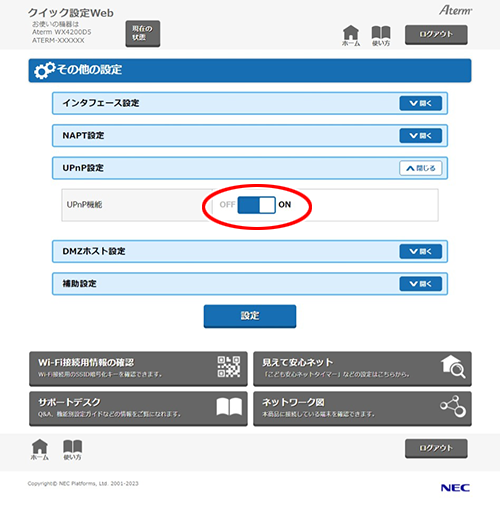 • 動作モードを上記のUPnP機能が使用できる動作モードに変更した場合は、本機能は有効(「ON」)になります。