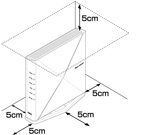 また、前後左右5cm、上5cm以内に、パソコンや壁などのものがない場所に設置してください。
