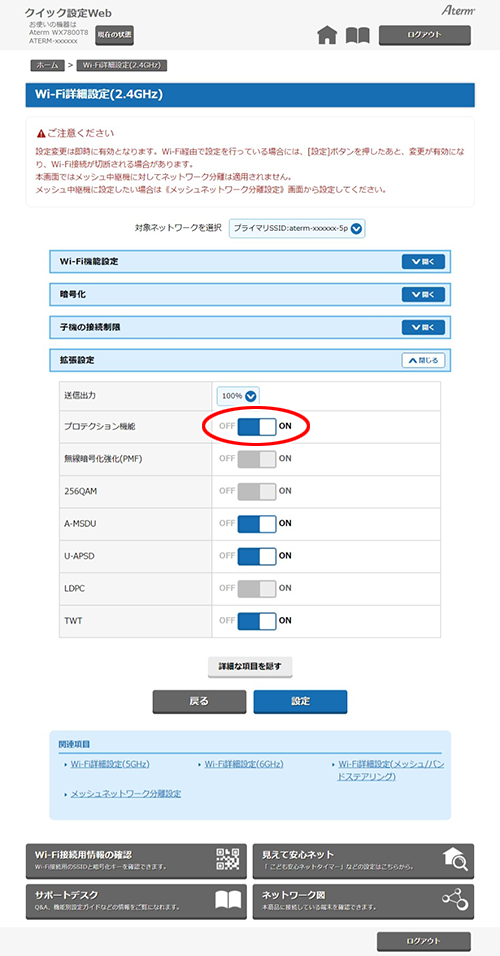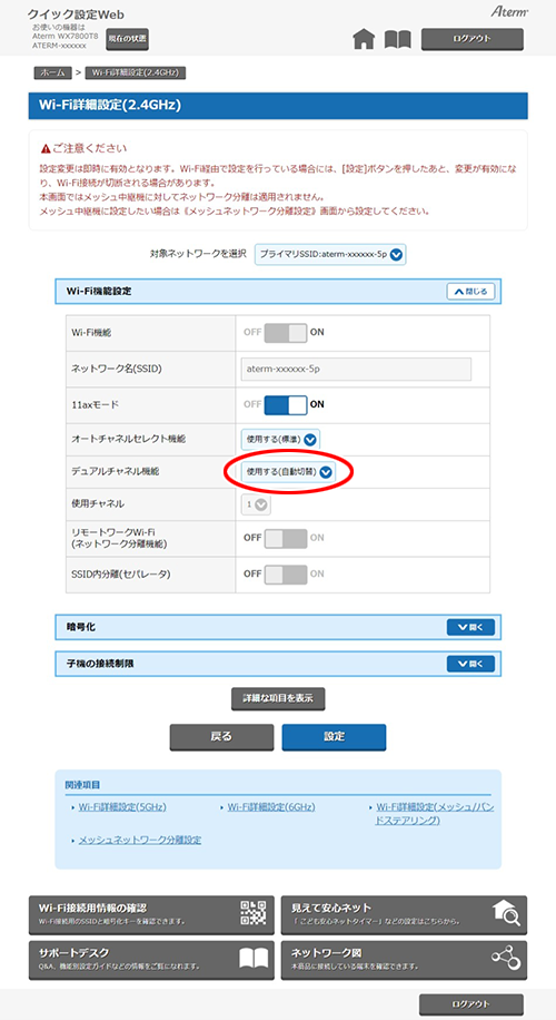 ※ 画面は「Wi-Fi詳細設定(2.4GHz)」の場合の例です。