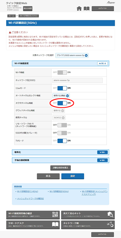※ 画面は「Wi-Fi詳細設定(5GHz)」の場合の例です。