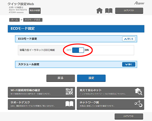「省電力型イーサネット(EEE)機能」を「ON」に設定して、[設定]をクリックします。