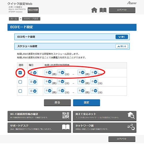 有線LANの速度を抑制する曜日・時間帯を選択・入力して「適用」にチェックし、[設定]をクリックします。