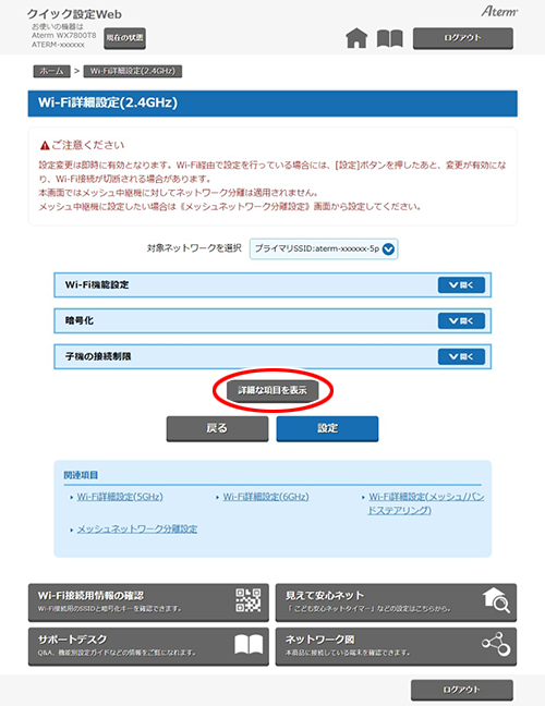 ※ 画面は「Wi-Fi詳細設定(2.4GHz)」の場合の例です。
