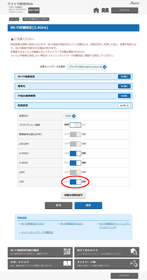 ※ 「11axモード」で「OFF」を選択すると「TWT」を変更できません。