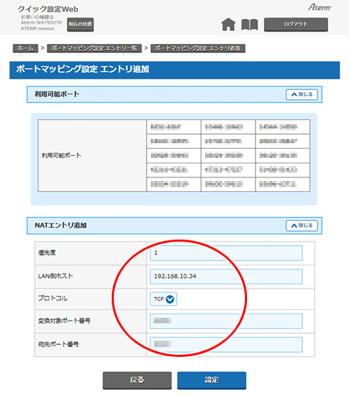 宛先ポート番号へWAN側からの通信を取り次ぐために、本商品が受け付けるポート番号を入力します。「利用可能ポート」に表示されているポート番号が設定できます。
