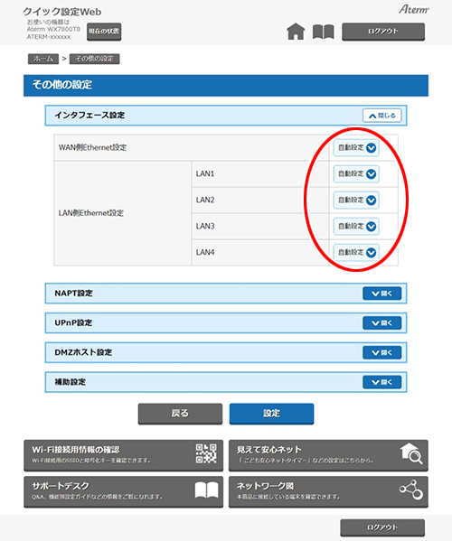 本商品を有線で使用する場合、WANとLANのポート伝送速度、および伝送モードを指定できます。