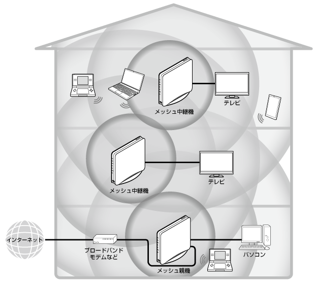 メッシュ中継機、メッシュ機能を利用しない中継機/子機については、「本商品の中継機能」を参照してください。