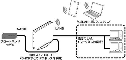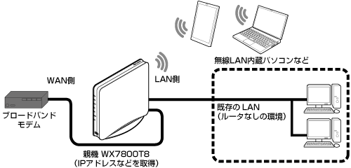 - 本商品のルータ機能を停止して利用するモードです。ルータまたはルータ機能内蔵のブロードバンドモデムなどに有線で接続するときに使用します。