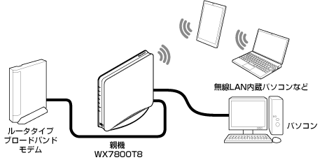 ルータタイプブロードバンドモデムにWi-Fi機能がない場合にもスマートフォンなどが接続できます。