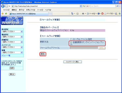 [更新方法]で「自動更新(オンラインバージョンアップ)」(または「オンラインバージョンアップ」)を選択して、