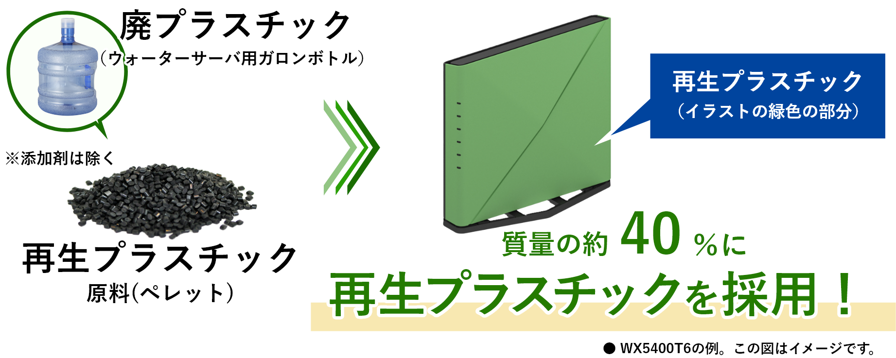 ウォーターサーバー用ボトルの廃プラスチック由来成分100%(添加剤を除く)を原料とした再生プラスチックをコニカミノルタ社と共同開発し、本体部品の一部に採用。WX5400T6、7200D8BEに再生プラスチックを採用
