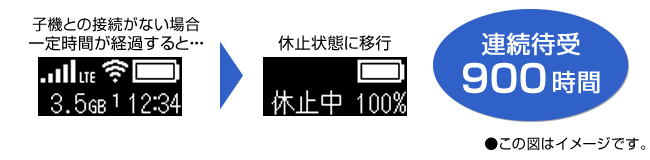子機との接続がない場合、一定時間経過したあと「休止状態」に移行し、電力の消費を抑えるので、連続待受 約900時間の長時間待機が可能です。電源ボタンを長押しすると復帰できます。