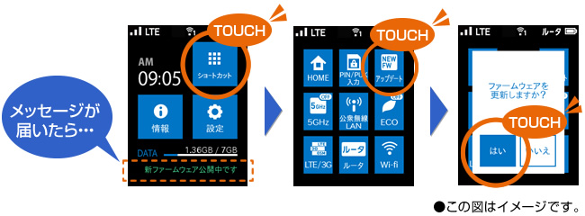 MR03LNのディスプレイに「新ファームウェア公開中です」と表示された場合は、新しいファームウェアが存在しています。