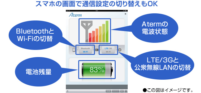 電波状況や電池残量の確認はもちろん、インターネットの接続(LTE/3G⇔公衆無線LAN)切り替え操作なども、MR03LNをバッグなどに入れたままスマートフォンの画面で行えます。
