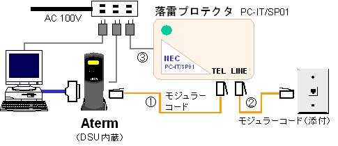 PC-IT/SP01のモジュラージャック(2個)とAterm(DSU内蔵)の回線モジュラージャック