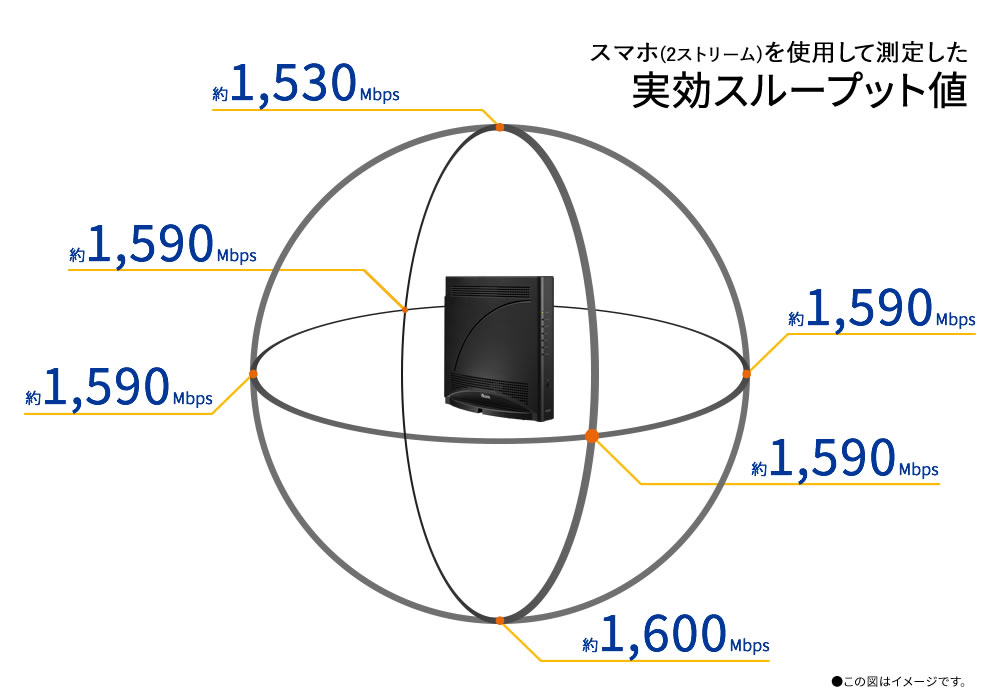 - ※1ご利用環境により異なりますので、ご利用の際の目安としてご参考にしてください。また、利用人数は、一人当たり3台程度の端末を接続した場合を想定しております。ただし、部屋の間取り、障害物の有無、通信量などによって、通信できない場合もあります。6GHz/5GHz/2.4GHzに分散して接続することを推奨します。