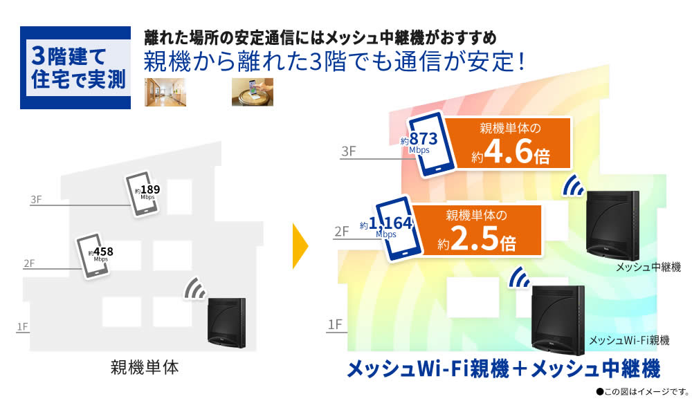 親機単体のみの測定値に対して、メッシュ中継機を利用した場合には2階が約2.5倍、3階は約4.6倍の結果となりました。この結果から分かるように親機から離れた場所の通信速度を高めたい、通信を安定させたい場合には、親機だけでなくメッシュ中継機の利用をおすすめします。