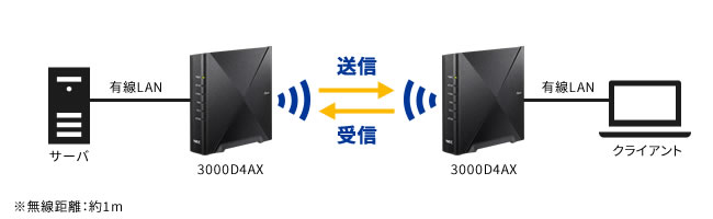 Aterm 3000D4AX[ブリッジモード]のWANポートに接続したサーバパソコンからAterm 3000D4AX[子機モード]を接続したクライアントパソコンへのデータ転送速度(送信)の実測値です。なお、クライアントパソコンからサーバパソコンへの通信速度(受信)は、送信速度より低い場合があります。