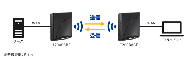 Aterm 7200D8BE[ブリッジモード]のWANポートに接続したサーバパソコンからAterm 7200D8BE[子機モード]を接続したクライアントパソコンへのデータ転送速度(送信)の実測値です。なお、クライアントパソコンからサーバパソコンへの通信速度(受信)は、送信速度より低い場合があります。