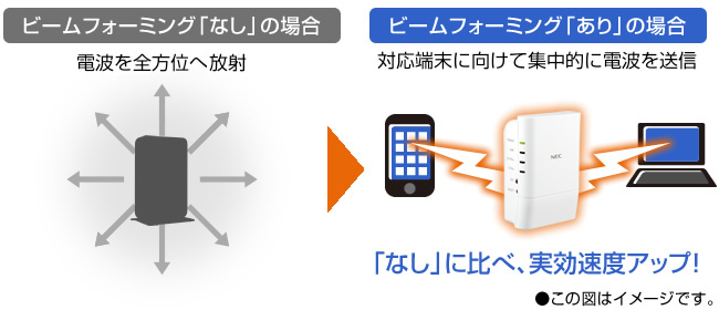 特定の通信相手に的を絞って電波を送る技術【ビームフォーミング】に対応しています。