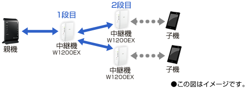 そんなとき、親機と子機の間に中継機「W1200EX/W1200EX-MS」を設置することで、これまで電波が届きにくかったエリアにも飛ばすことができます。